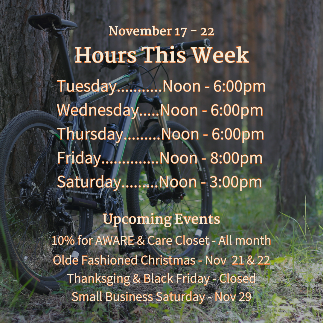Hours for November 17 through 22. We have a full week ahead with Olde Fashioned Christmas coming up and holiday shopping underway. 🎁 10% for AWARE and Care Closet this month.