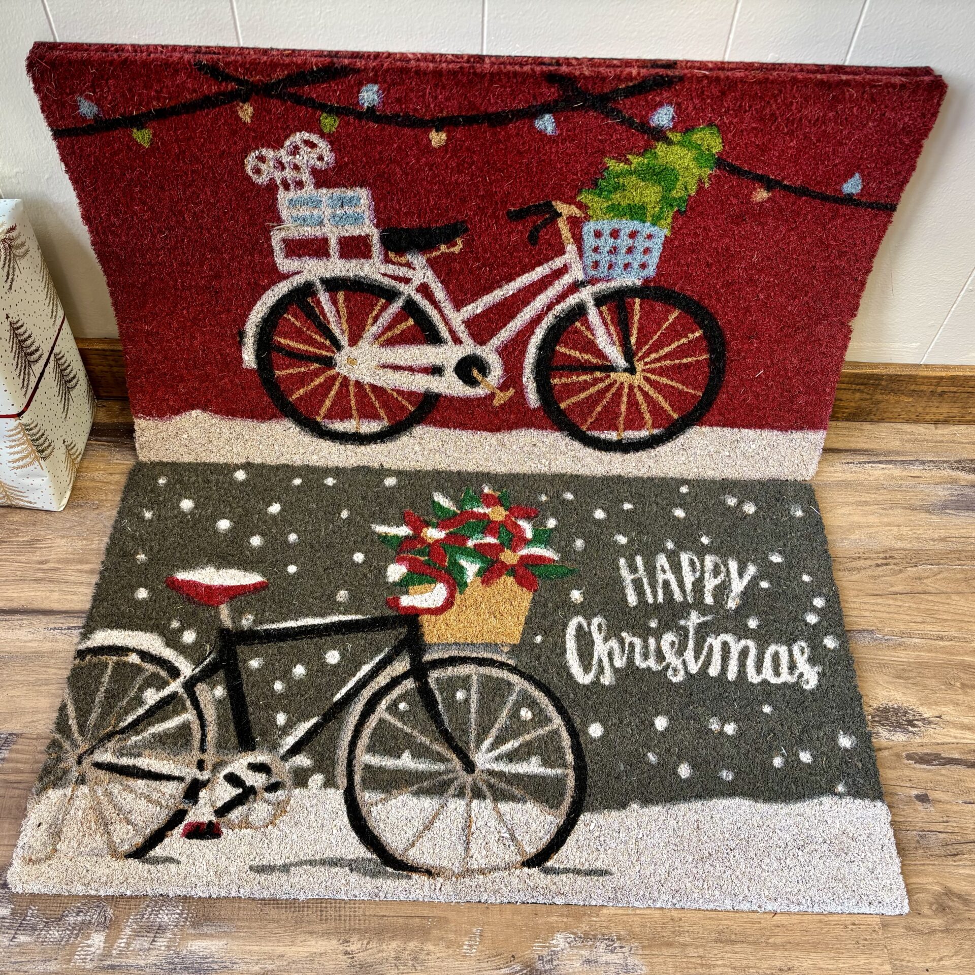These just showed up at the shop and there are only a few. Show your love of cycling throughout the holiday season with a new doormat. Each is 18″ x 30″ and made from coconut shell husks. Non-shedding with a rubber backing. $24.99 each
