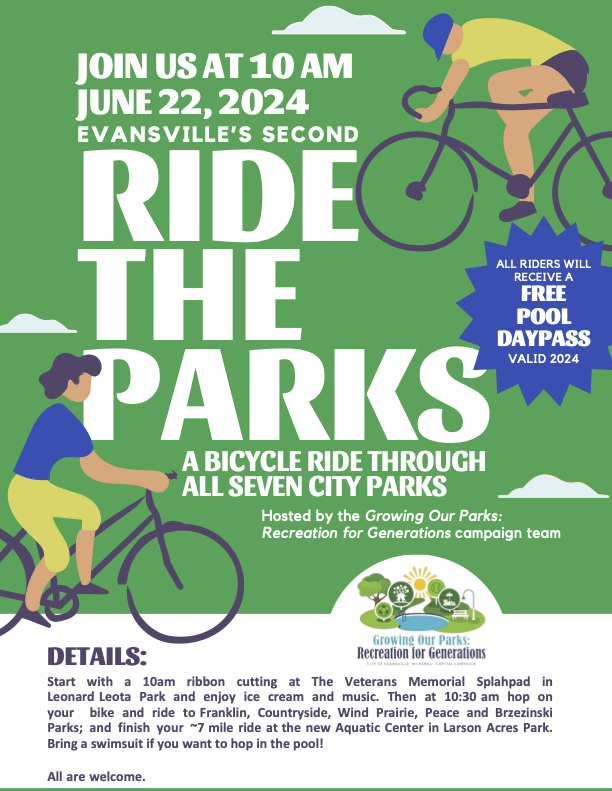 The second annual Ride the Parks will be Saturday, June 22nd. Start with the ribbon cutting at the Veterans Memorial Splashed at 10am and enjoy some music and ice cream. Hop on your bike at 10:30 for the seven park tour and finish up at Larson Acres Park. All riders get a free pool day…