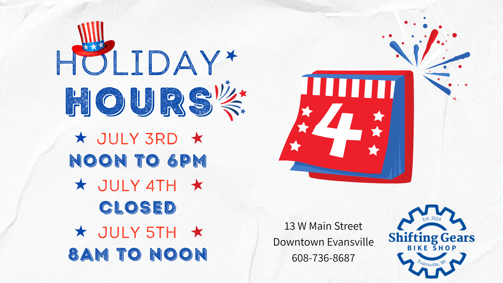 Holiday Hours This Week — Normal hours on Tuesday, Wednesday and Thursday — Closed on Friday — Normal hours on Saturday