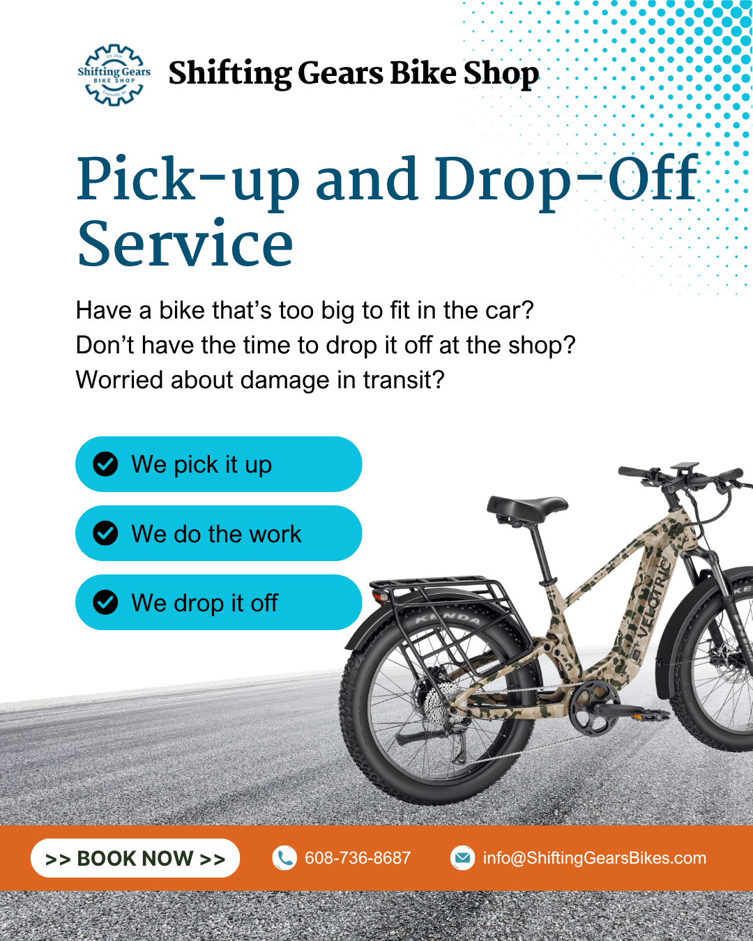 E-Bike have a flat? Cruiser need a tune-up? Let us take the hassle out of getting your bike to the shop and use our pick-up and drop-off service.